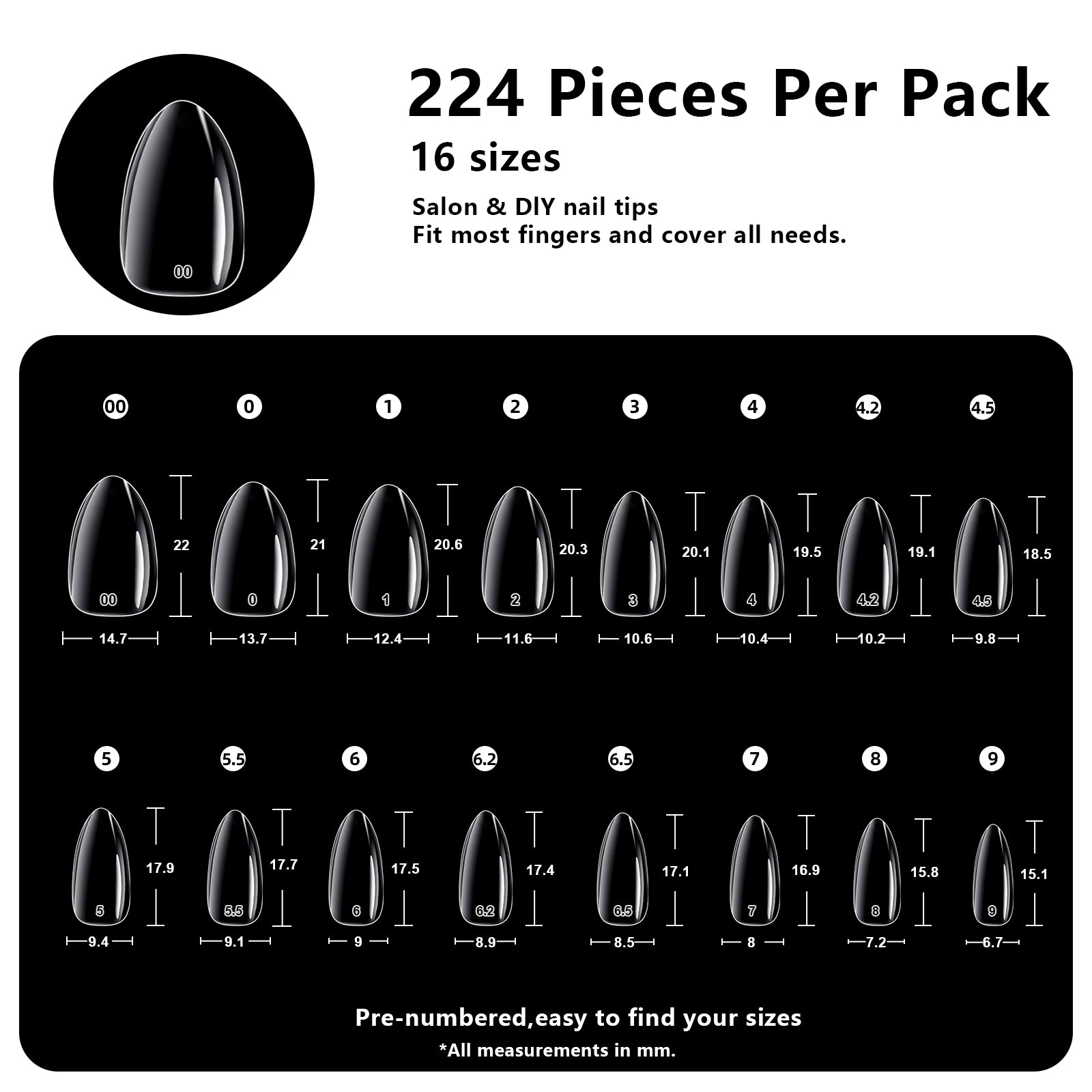 - 【224 Pcs in 16 Sizes for Perfect Fit】 Includes 224 nail tips in 16 precise sizes, fitting over 95% of natural nail beds. Each size is clearly labeled for quick selection, eliminating guesswork. Short Almond shape is universally flattering, creating a natural elongated look for all hand types.