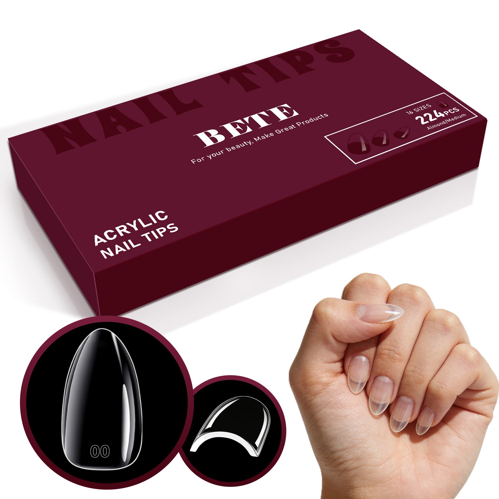 - 【Premium Clear Acrylic Full Cover Nail Tips】 Crafted with high-quality clear acrylic—odor-free, skin-friendly and lightweight. BETE Medium Almond nail tips feature a full-cover design that fits seamlessly over natural nails, pre-shaped for a salon-worthy look—no tedious filing needed. Ideal for DIY enthusiasts and professional manicurists to save time.