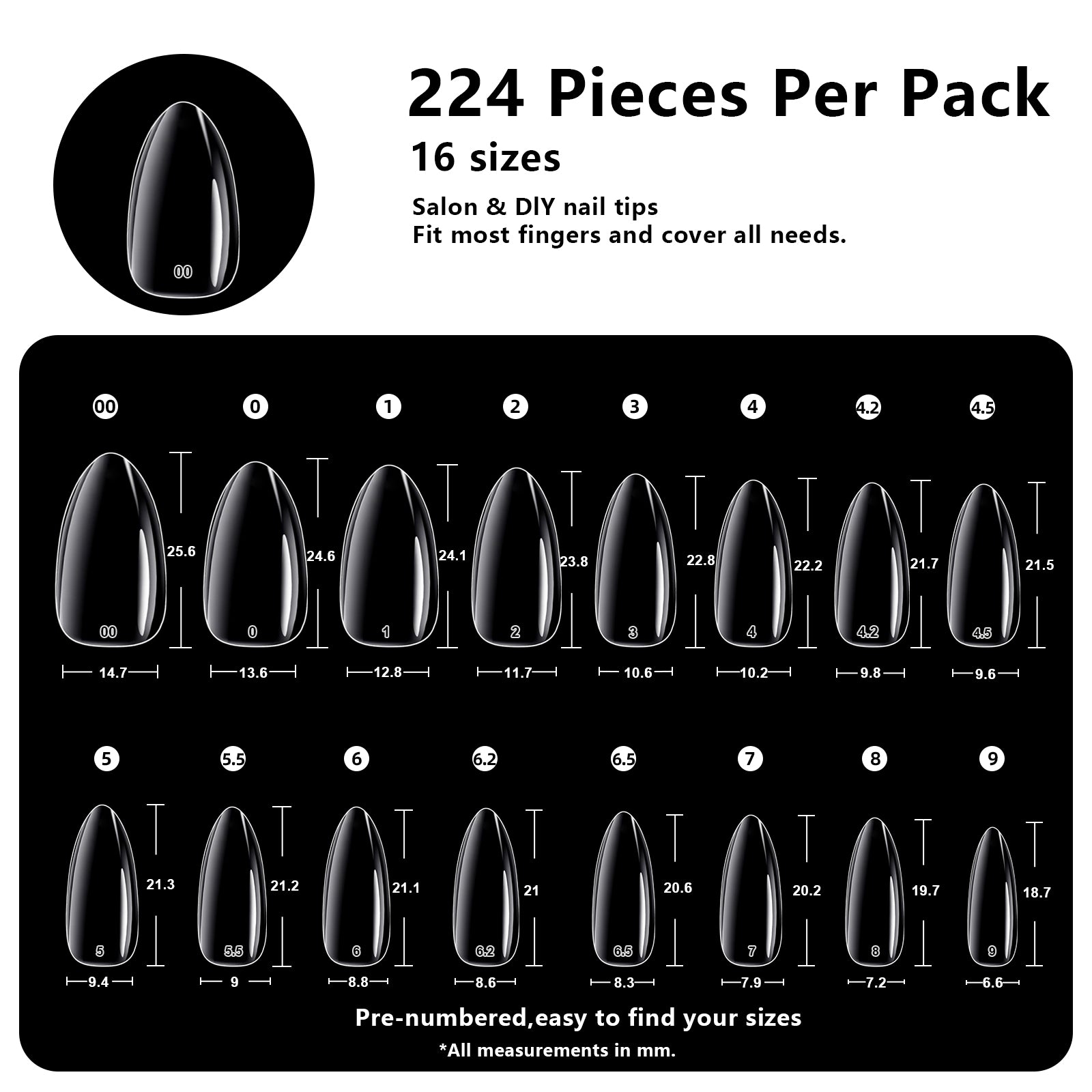 - 【224 Pcs in 16 Sizes for Perfect Fit】 Includes 224 nail tips in 16 precise sizes, fitting over 95% of natural nail beds. Each size is clearly labeled for quick selection, eliminating guesswork. Medium Almond shape is universally flattering, creating a natural elongated look for all hand types.