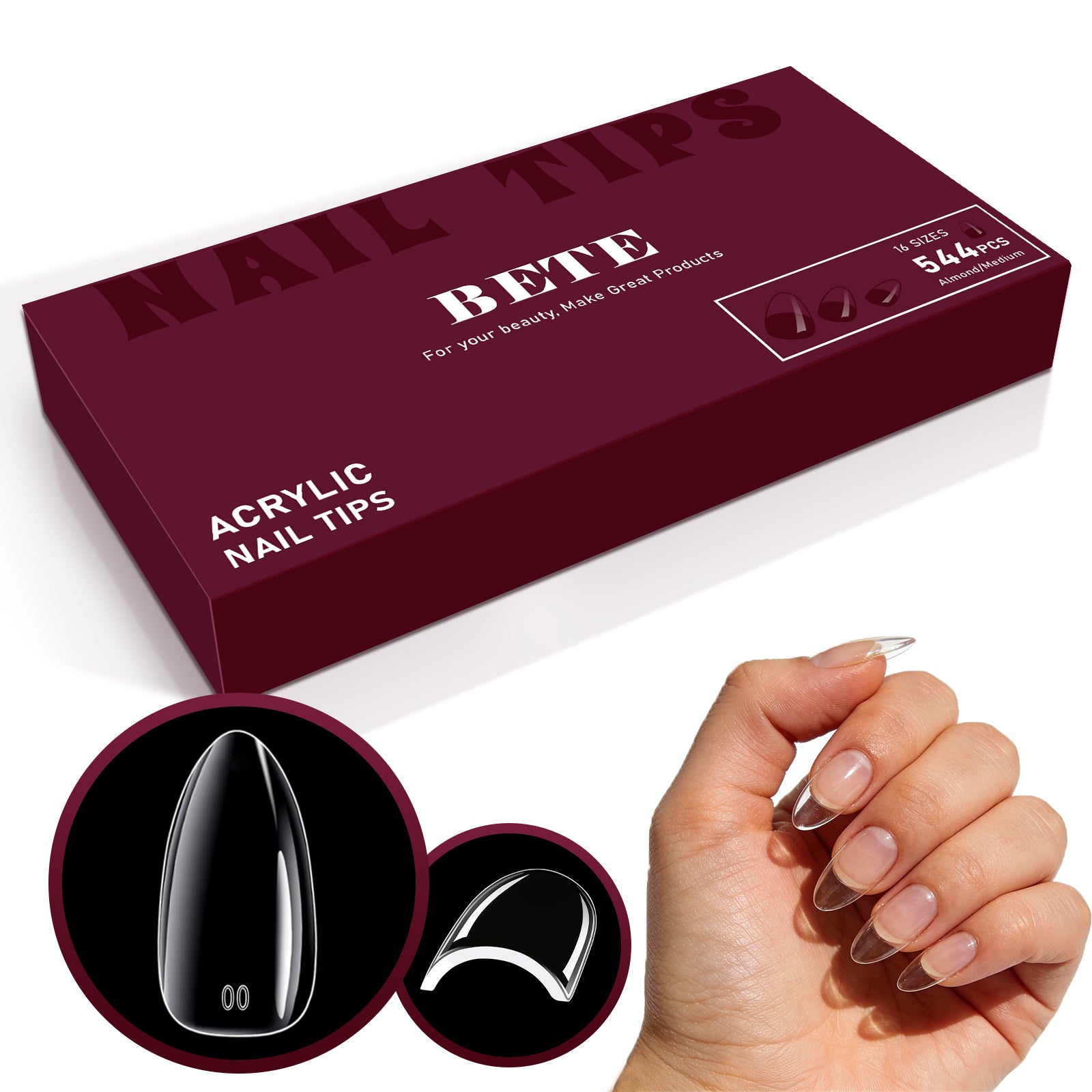 - 【Premium Clear Acrylic Full Cover Nail Tips】 Crafted with high-quality clear acrylic—odor-free, skin-friendly and lightweight. BETE medium almond nail tips feature a full-cover design that fits seamlessly over natural nails, pre-shaped for a salon-worthy look—no tedious filing needed. Ideal for DIY enthusiasts and professional manicurists to save time.