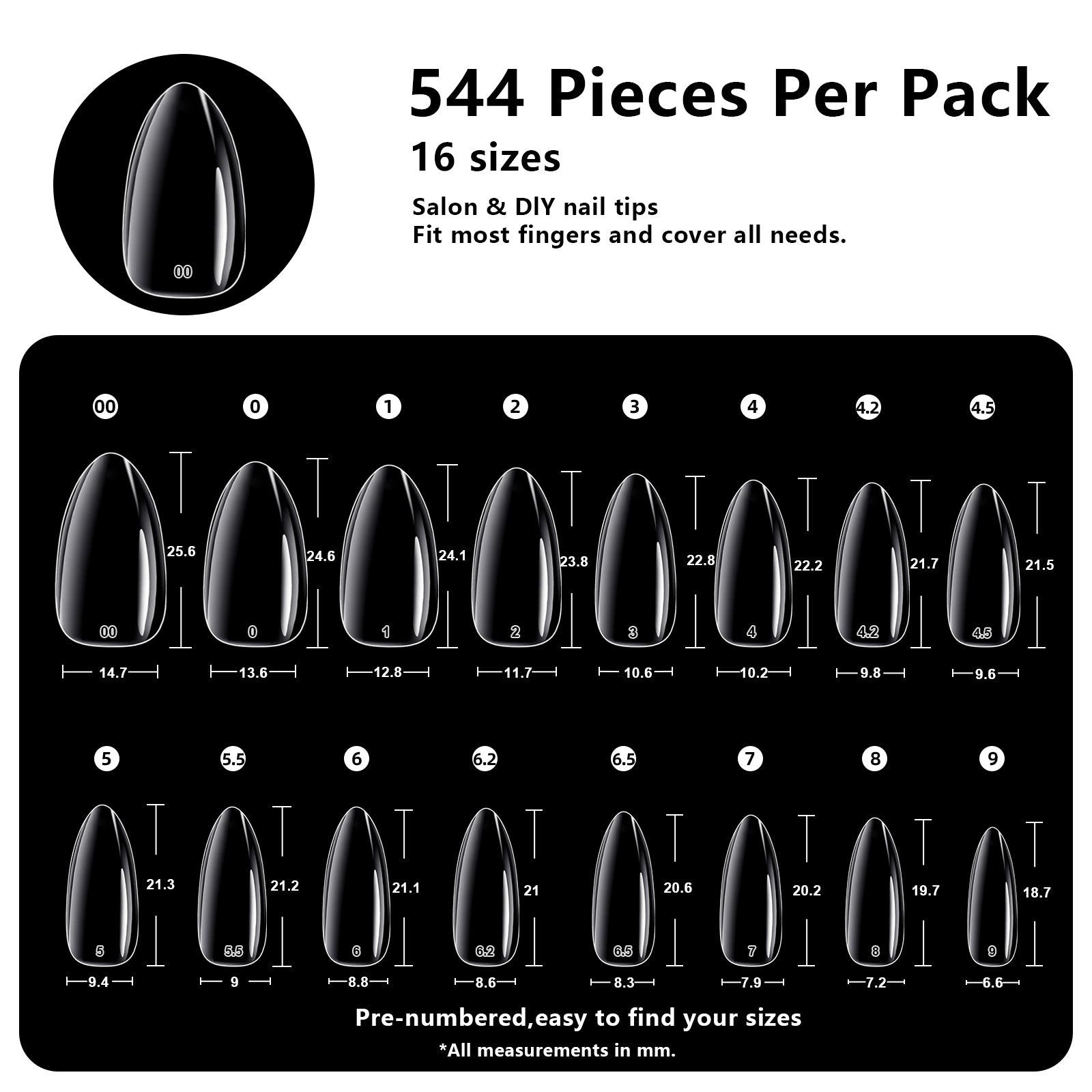 - 【544 Pcs in 16 Sizes for Perfect Fit】 Includes 544 nail tips in 16 precise sizes, fitting over 95% of natural nail beds. Each size is clearly labeled for quick selection, eliminating guesswork. Medium Almond shape is universally flattering, creating a natural elongated look for all hand types.