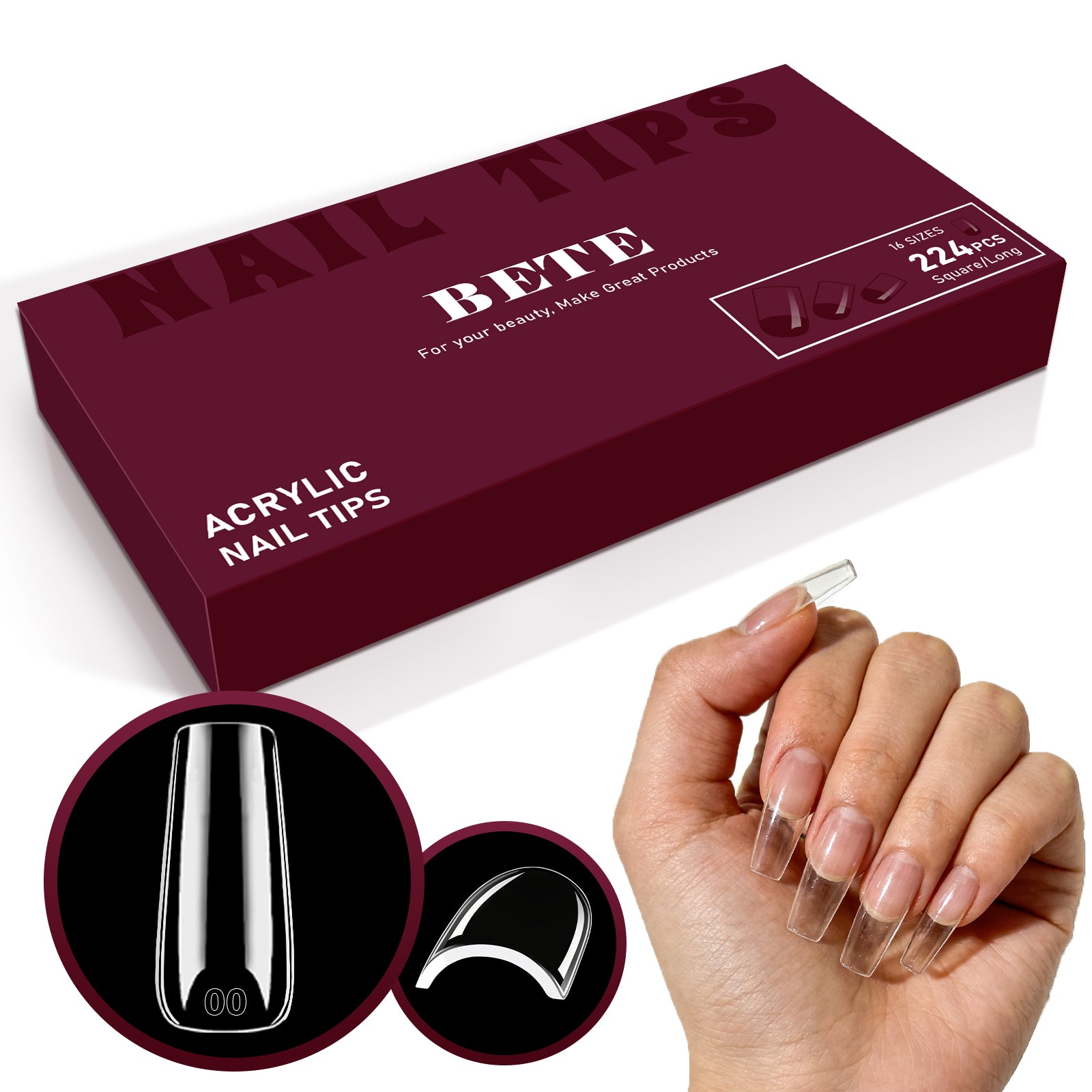 - 【Premium Clear Acrylic Full Cover Nail Tips】 Crafted with high-quality clear acrylic—odor-free, skin-friendly and lightweight. BETE Long Square nail tips feature a full-cover design that fits seamlessly over natural nails, pre-shaped for a salon-worthy look—no tedious filing needed. Ideal for DIY enthusiasts and professional manicurists to save time.